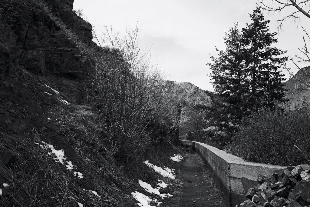 The Clear Creek Trail is located on an irrigation flume originally named the Welch Ditch. The Canal Zone Crag is adjacent to the eastern segment of the CCT. Welch Ditch is an important historic site just west of Golden, Colorado. Construction of the Welch Ditch by the Vasquez Flume and Ditch Company began in 1871. The ditch took water from Clear Creek just above Tunnel #1 and transported it to the city of Golden and eventually out past South Table Mountain into Lakewood. At the time Golden was an industrial hub including railroad transport, smelters, clay mining, brick and tile production and other related sundries required in the gold mining supply chain. Charles Welch owned various investments in local real estate, mines and also the Colorado Central Railroad which connected mines near Georgetown and Central City to Golden, Boulder, Longmont and eventually the Transcontinental Railroad in Pine Bluff, Nebraska. Charles Welch was a vital player in the development of Golden and beyond. In 1896 a major flood destroyed much of the ditch and killed 29 Jefferson County residents. The flume was rebuilt by William “Cement Bill” Williams who is better known for designing and building Lookout Mountain Road. Part of the CCT follows this old water flume which passes through a rock climbing area dubbed the “Canal Zone”. In my wanderings I have been able to walk a majority of the flume previous to improvements creating the present trail. Be wary of ghosts and falling rocks.